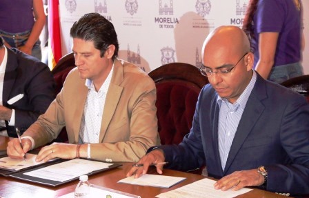 Morelia, Mich., a 17 de Junio del 2016.-Con el propósito de impulsar el crecimiento económico y la inversión en los sectores industrial, comercial y de servicios de la región y como parte del Proyecto de Gran Visión Morelia NeXT, el Presidente Municipal, Alfonso Martínez Alcázar signó el convenio para integrar a Morelia como parte del Proyecto del Corredor Central del Bajío, con el Alcalde de Querétaro, Marcos Aguilar Vega.