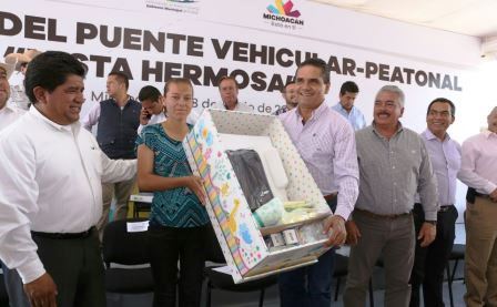 - En gira de trabajo por Maravatío, el mandatario inauguró el puente vehicular-peatonal Vista Hermosa, que tuvo una inversión cercana a los 5 millones de pesos.