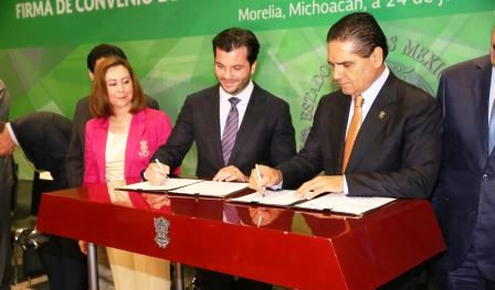 Morelia, Michoacán, a 24 de junio de 2016.- El Gobernador del Estado, Silvano Aureoles Conejo y el secretario de Medio Ambiente y Recursos Naturales, Rafael Pacchiano Alamán, signaron el convenio marco de coordinación Semarnat-Gobierno de Michoacán, así como el acuerdo para la instrumentación del Proaire, lo que permitirá fortalecer las acciones en materia de cuidado del medio ambiente en la entidad.