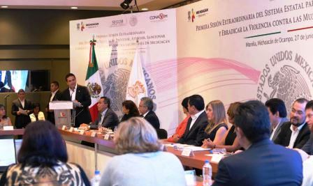 Durante la primera Sesión Extraordinaria del Sistema Estatal para Prevenir, Atender, Sancionar y Erradicar la Violencia contra las Mujeres en Michoacán, que también estuvo encabezada por el secretario de Gobernación, Miguel Ángel Osorio Chong, el funcionario federal entregó al Gobernador la notificación oficial de la Alerta de Violencia de Género contra las Mujeres, para 14 municipios de la entidad: Apatzingán, Uruapan, Morelia, Pátzcuaro, La Piedad, Hidalgo, Lázaro Cárdenas, Zamora, Maravatío, Zitácuaro, Los Reyes, Tacámbaro, Huetamo y Sahuayo.