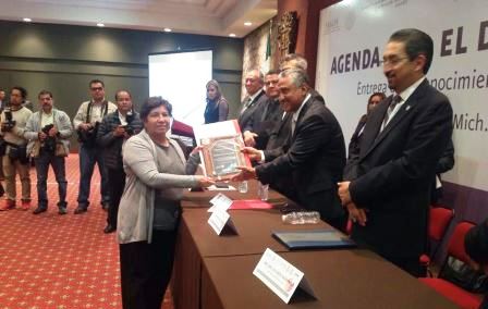 Ciudad Hidalgo.- María Alma Eugenia García Ramírez, Encargada del Despacho de Presidencia Municipal de Hidalgo, recibió de manos del Vocal Ejecutivo del Centro Estatal para el Desarrollo Municipal (CEDEMUN) la certificación de los 169 indicadores del Programa Agenda de Fortalecimiento Municipal, así como premio especial que otorga el Instituto Nacional para el Federalismo y Desarrollo Municipal (INAFED).