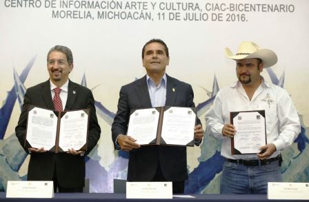 Lo anterior, al firmar como testigo de honor el convenio que signaron el rector de la Universidad Michoacana de San Nicolás de Hidalgo, Medardo Serna González y Emilio Vieyra Vargas, representante no gubernamental del Sistema Producto Maguey Mezcal, con el cual se establecerá un laboratorio que certifique la bebida producida en la entidad y con ello, se reduzcan los costos de certificación y se potencialice la comercialización de mezcal fuera del estado.