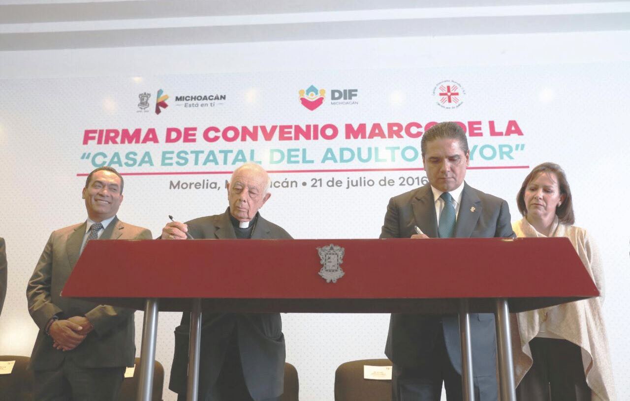 Morelia, Michoacán, a 21 de julio de 2016.- El Gobernador Constitucional Silvano Aureoles Conejo y el cardenal Alberto Suárez Inda, en calidad de representante de Cáritas Diocesana, firmaron el convenio marco para la construcción de la primera Casa Estatal del Adulto Mayor, que se edificará en las antiguas instalaciones del Sanatorio de los Remedios en Zitácuaro, y con una capacidad para atender hasta 300 adultas y adultos mayores, con actividades recreativas, de salud, entre otras, a fin de que vivan esta etapa de manera digna.