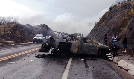 Maravatío, Mich.- Un policía de la Fuerza Ciudadana (FC) de Maravatío murió calcinado y cinco más resultaron heridos, cuando la patrulla en la que viajaban se salió de control, chocó contra un montón de tierra y piedras y se quemó, trascendió durante la cobertura periodística.