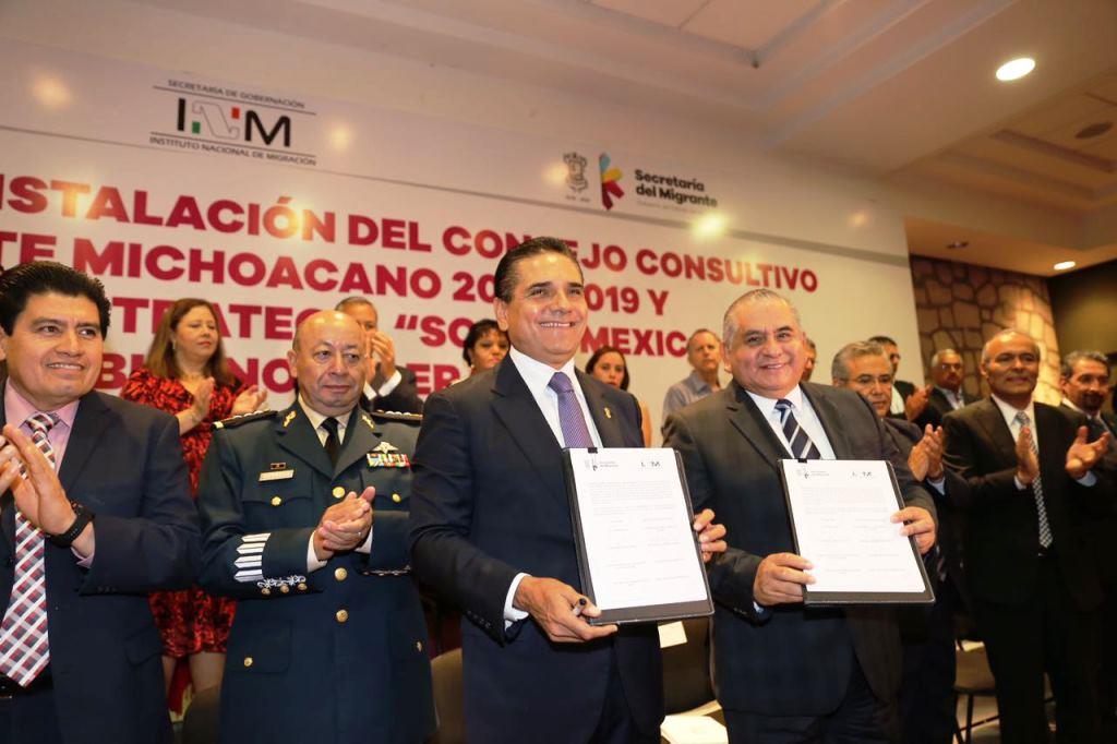Morelia, Michoacán.- En Michoacán hay Gobierno y vamos a poner este Estado en orden y a generar las condiciones para salir adelante, y sé que en este reto voy a contar con el apoyo de mis paisanas y paisanos migrantes, afirmó el Gobernador Constitucional, Silvano Aureoles Conejo, al presentar con el comisionado del Instituto Nacional de Migración (INM), Ardelio Vargas Fosado, la estrategia federal “Somos Mexicanos”.