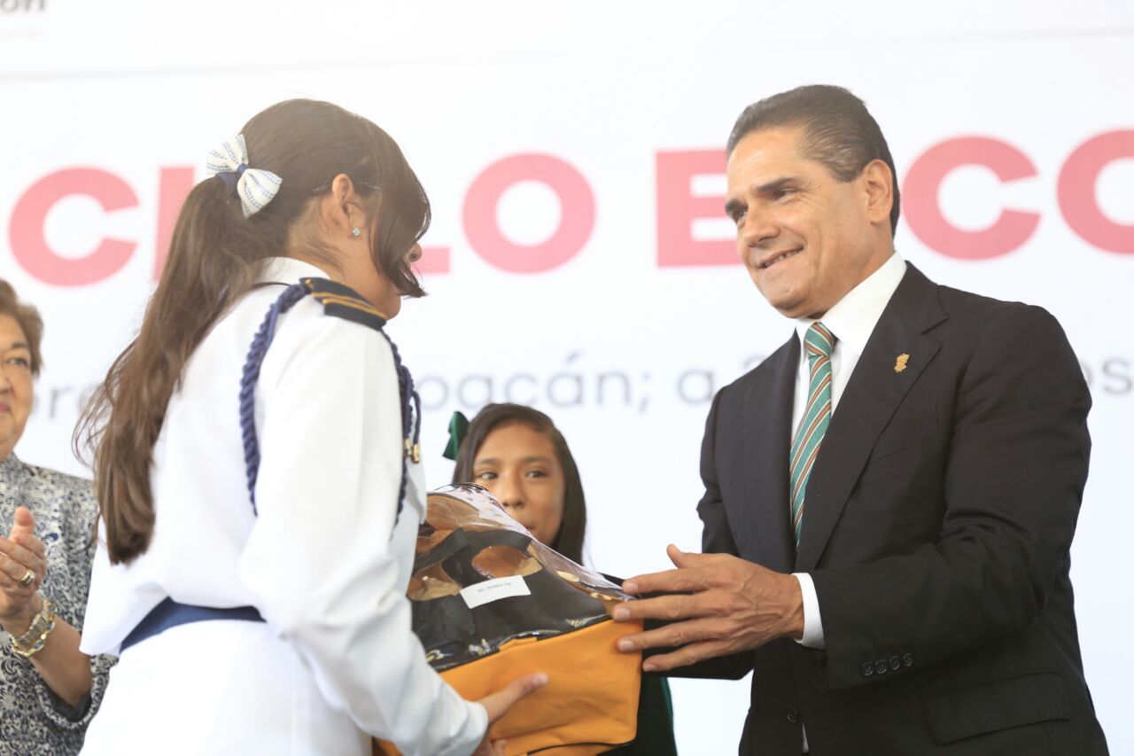 En esta actividad, el mandatario estatal entregó paquetes de útiles, uniformes y zapatos escolares. Además, se comprometió a apoyar a este plantel escolar con la construcción de la barda perimetral, remodelar las canchas deportivas y otros espacios abiertos, así como con mobiliario.
