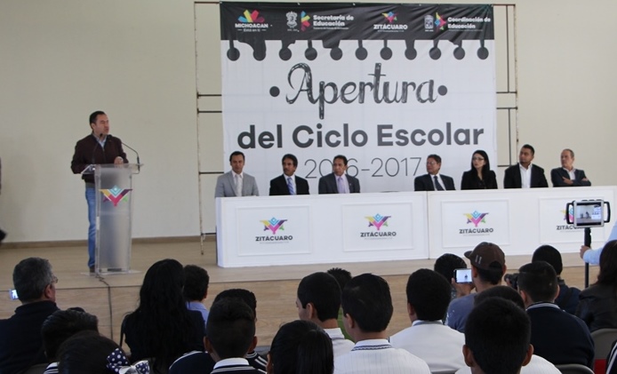 Zitácuaro, Mich.- Con el firme compromiso de seguir sumando esfuerzos para fortalecer el sector educativo en Zitácuaro, el presidente municipal, Carlos Herrera Tello, inauguró el Ciclo Escolar 2016 – 2017 en las instalaciones de la Escuela Secundaria Técnica “Samuel Ramos” donde estuvo acompañado por autoridades educativas de la región y el estado.