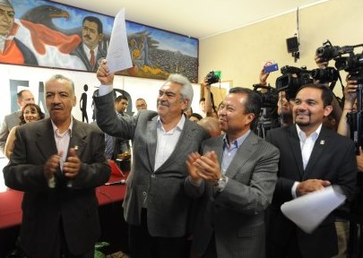 Morelia, Mich., a 21 de marzo de 2015.- El Partido Revolucionario Institucional (PRI), solicitó al Instituto Electoral de Michoacán (IEM) el registro de su candidato al gobierno del estado, José Ascensión Orihuela Bárcenas, ante la presencia de los líderes nacional y estatal del PRI, César Camacho Quiroz y Agustín Trujillo Iñiguez.