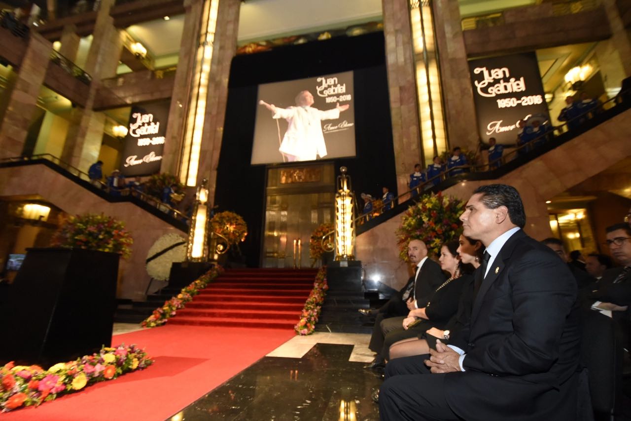 a 5 de septiembre de 2016.- El Gobernador Constitucional, Silvano Aureoles Conejo, con la representación del pueblo de Michoacán, acudió al homenaje que se realizó en el Palacio de Bellas Artes, en honor al cantautor de origen michoacano, Alberto Aguilera Valadez, Juan Gabriel, quien falleció hace ya una semana.
