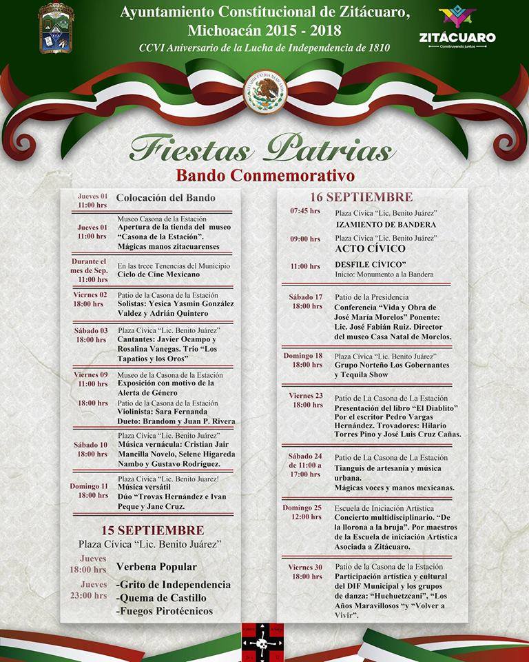 Zitácuaro, Mich., 20 de septiembre del 2016.-Este próximo fin de semana, disfruta de las distintas actividades culturales y artísticas programadas en el marco de las fiestas patrias, conmemorativas al 206 aniversario del inicio de la Independencia de México, cartelera que concluirá el 30 de septiembre, ofrecida para todo el público de manera gratuita, por el Gobierno que preside Carlos Herrera Tello.
