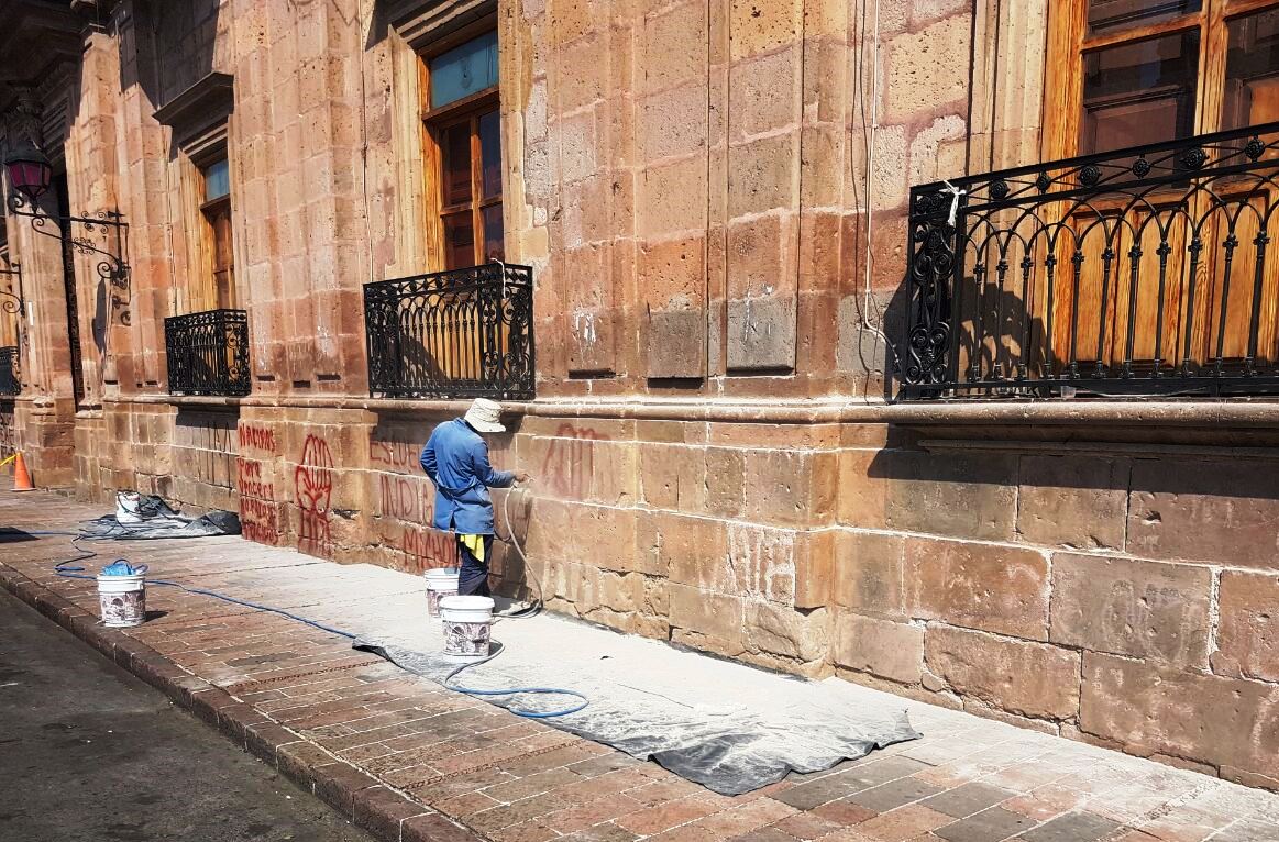 Trabajan Brigadas de limpieza para borrar grafitis de Edificios Históricos en Morelia