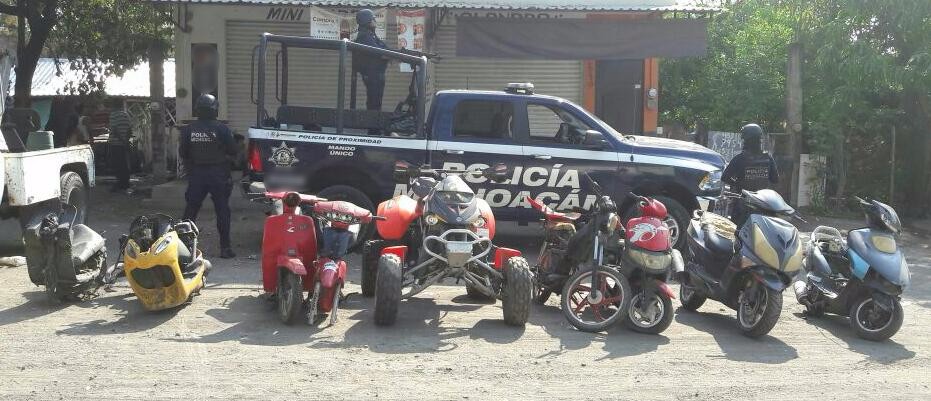 Como parte de estos resultados, en la calle Gertrudis Sánchez del municipio de Apatzingán, los agentes aseguraron nueve motocicletas, seis de ellas de la marca Italika, una de la marca Vento, una de la marca Bombardier y una más de la marca Bajaj, mismas que carecían de números de identificación.
