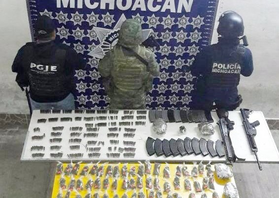 SSP, Sedena y PGJE aseguran armas, granada, droga y vehículo en Apatzingán