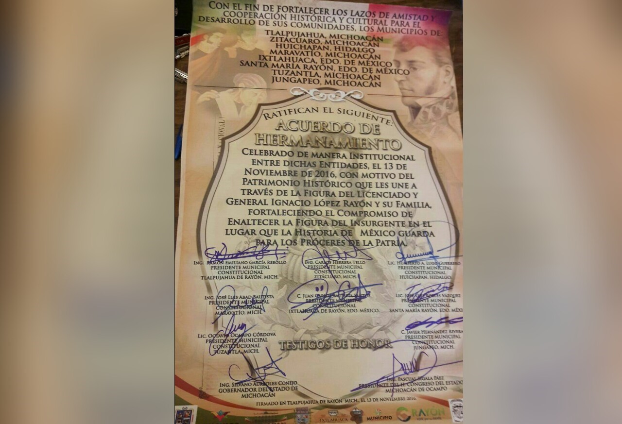 Zitácuaro, Mich., 15 de noviembre de 2016. Con la idea de fortalecer los vínculos de identidad histórica y cultural derivada del legado del General Ignacio López Rayón, entre el municipio de Zitácuaro con Tlalpujahua, Maravatío, Tuzantla y Jungapeo en Michoacán; Ixtlahuaca y Santa María Rayón, en el Estado de México; así como Huichapan, Hidalgo; este domingo se signó el Acuerdo de Hermanamiento entre estos siete lugares.