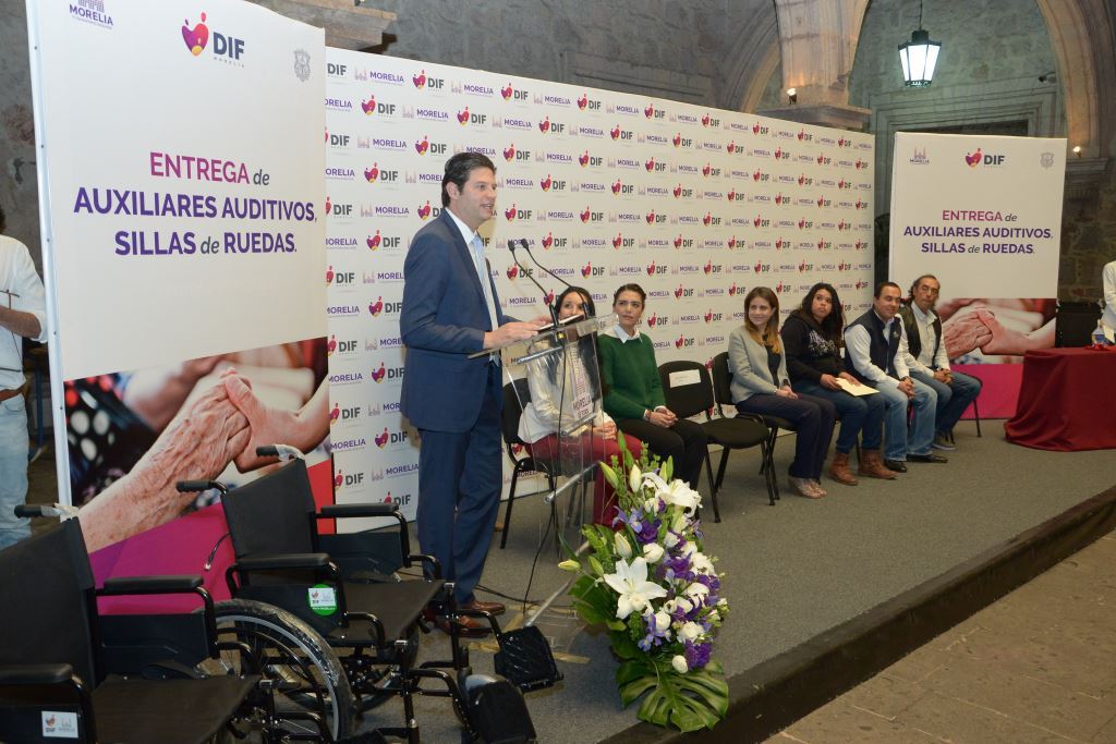 Morelia, Mich.- El presidente municipal, Alfonso Martínez Alcázar ratificó su compromiso por hacer de Morelia un municipio más incluyente mediante acciones transversales que promuevan la cultura de la discapacidad, al hacer la entrega este viernes de cien auxiliares auditivos y 38 sillas de ruedas a personas que hicieron su trámite de solicitud en el DIF Morelia, lo que suma un total de 120 beneficiarios en 2016.