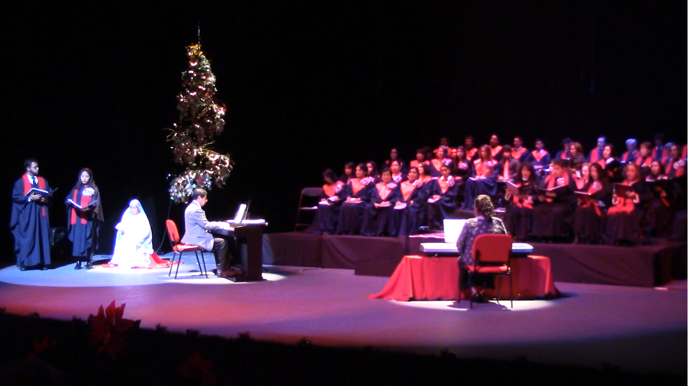 Con la participación de 49 voces en total, ambos coros, bajo de la dirección de Cuauhtémoc Pichardo Cedeño y Gracia Luz Bernáldez, respectivamente; y ante el teatro completamente lleno, interpretaron un repertorio que inició con el tradicional “Pedimento de Posada”; seguido de los villancicos “A todos los presentes”, de Inglaterra y “Allá en Belén”, de Alemania.