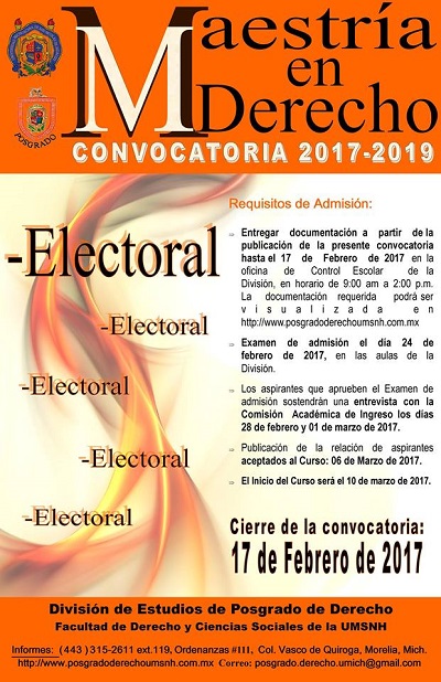 Morelia, Michoacán.-De acuerdo a los objetivos de la Universidad Michoacana de San Nicolás de Hidalgo de brindar una educación pertinente y vinculada a la realidad social del país, la Facultad de Derecho y Ciencias Sociales, a través de su División de Estudios de Posgrado, abre la convocatoria para la Maestría en Derecho Electoral.