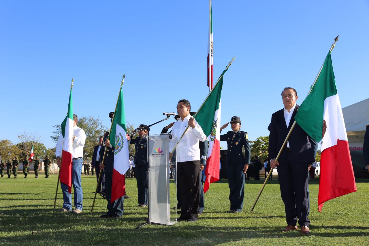 Nueva Italia, Mpio. de Múgica, Michoacán.– Es momento de demostrar con patriotismo que estamos preparados para enfrentar los retos, pero también para defender a nuestra Patria, nuestra soberanía, nuestro México, nuestra dignidad y defender lo que somos como mexicanos y michoacanos, porque somos un gran pueblo y como México no hay dos; enfatizó el Gobernador Constitucional Silvano Aureoles Conejo.