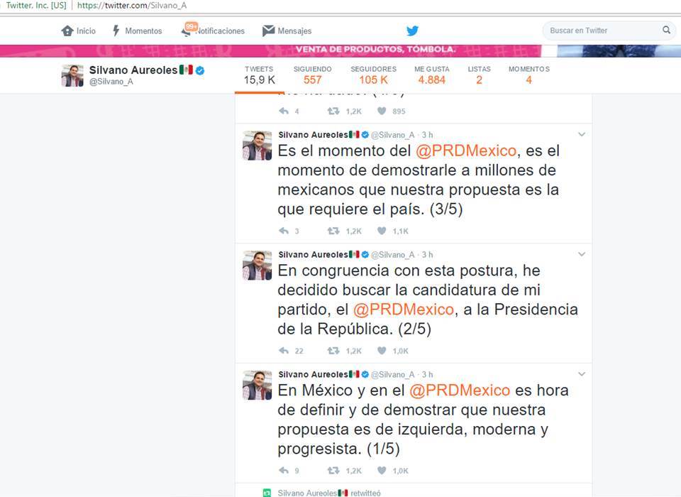 Más tarde, el mandatario estatal posteo en su cuenta de twitter “En México y en el PRD México es hora de definir y demostrar que nuestra propuesta es de izquierda, moderna y progresista. En congruencia con esta postura, he decidido buscar la candidatura, de mi partido el PRD, a la Presidencia de la República. Es momento del PRD, es momento de demostrarle a millones de mexicanos que nuestra propuesta es la que requiere el país. Mi responsabilidad y empeño hoy por hoy, es Michoacán; ser Gobernador de mi estado es el más alto honor que la vida me ha dado. El PRD es un proyecto vivo; lo defenderé con todo, Vamos a rescatar los orígenes del PRD del cual soy, orgullosamente, miembro fundador”.