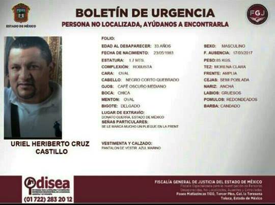 Según los datos difundidos el funcionario responde al nombre de Uriel Heriberto Cruz Castillo, quien no ha sido localizado luego de que saliera el día vienes de su oficina en Donato Guerra a bordo de su vehículo oficial , un nissan tipo sentra, color gris, con placas de circulación MBP2723.