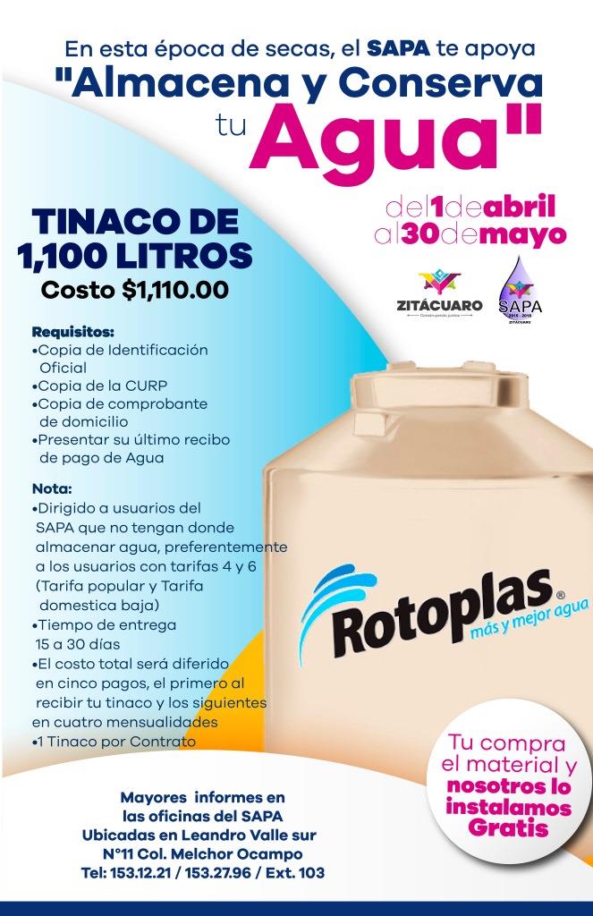 A partir del primero de abril, los usuarios que se encuentren en esta situación podrán tener acceso a un tinaco de mil 100 litros. La convocatoria se cerrará el día 31 de mayo; sin embargo, llamó a las familias solicitantes acudan cuanto antes al Sapa. Quienes podrán tener acceso a este beneficio serán los usuarios que pertenezcan a las tarifas 4 y 6; es decir, la popular y doméstica baja.
