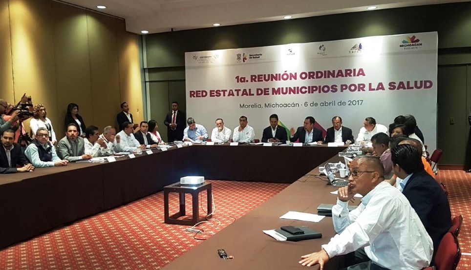 Morelia, Mich.- El alcalde de Zitácuaro y Presidente de la Red Estatal de Municipios de la Salud, Carlos Herrera Tello y el Gobernador del Estado, Silvano Aureoles Conejo, encabezaron la Primera Reunión Ordinaria de dicha organismo, donde se dieron cita representantes de las ocho jurisdicciones sanitarias de la entidad, así como funcionarios estatales en esta materia.