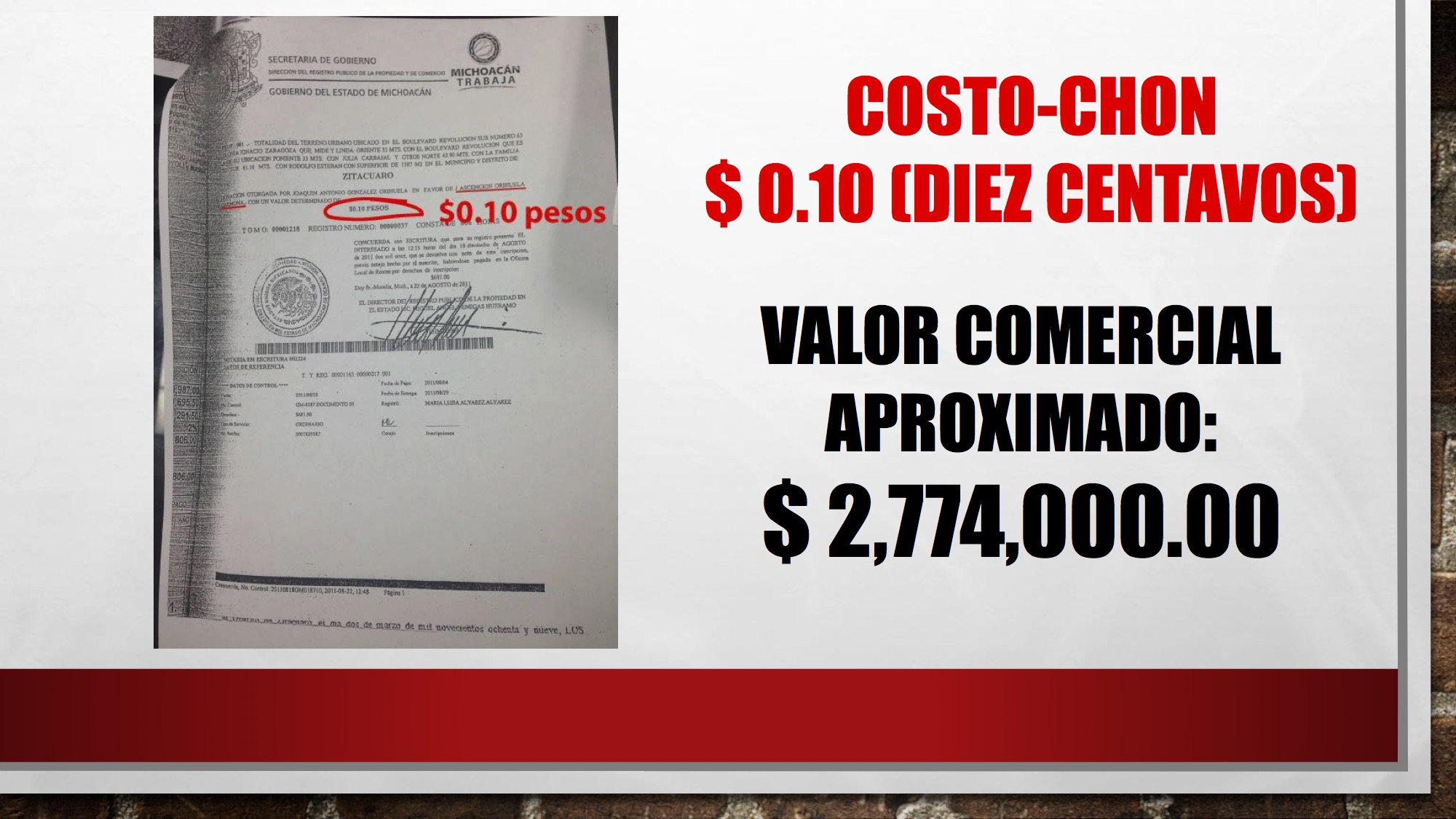 + “Con el apoyo ilegal de un notario en Zitácuaro, compró extensas propiedades valuadas a precios irrisorios, por ejemplo un terreno valuado comercialmente en 3 millones de pesos, ¡reportó un valor de 10 centavos!”, detalla el delegado del CEN.