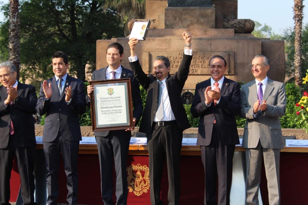 Esta presea, distinción sin par -subrayó el rector nicolaita- fortalece y enaltece a la Casa de Hidalgo, a la vez que recuerda a la actual generación el gran compromiso social que tiene que hacer realidad, al igual que Morelos, basados en una educación pertinente y de calidad, para lograr la construcción de una sociedad michoacana y mexicana más justa y libre.