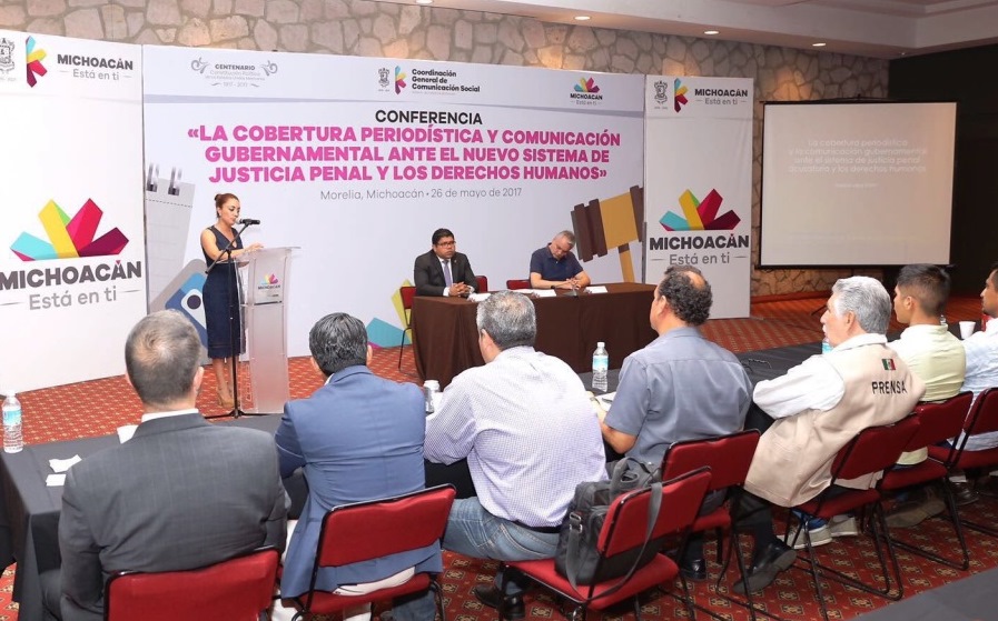 Morelia, Michoacán.- En cumplimiento al compromiso del Gobernador Silvano Aureoles Conejo, de apoyar la profesionalización y actualización de las y los periodistas y comunicadores michoacanos, esta tarde el reconocido periodista Marco Lara Klahr impartió la conferencia “La cobertura periodística y comunicación gubernamental ante el Nuevo Sistema de Justicia Penal y los Derechos Humanos”.