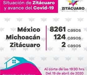 Zitácuaro, Mich.- El gobierno municipal de Zitácuaro que encabeza el alcalde Hugo Alberto Hernández Suárez informa que, de acuerdo a la información emitida por el Comité Estatal de Seguridad en Salud , al corte de las 19:30 hrs., del 19 de abril de 2020, al momento se registran para COVID-19: