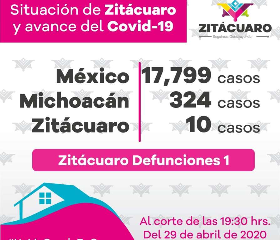 Zitácuaro, Mich.- Con corte a las 19:30 horas, de este miércoles 29 de abril del 2020, el Gobierno municipal de Zitácuaro presidido por el alcalde Hugo Alberto Hernández Suárez, comunica que de acuerdo a la información brindada por el Comité Estatal de Seguridad en Salud, al momento se registran para COVID-19: