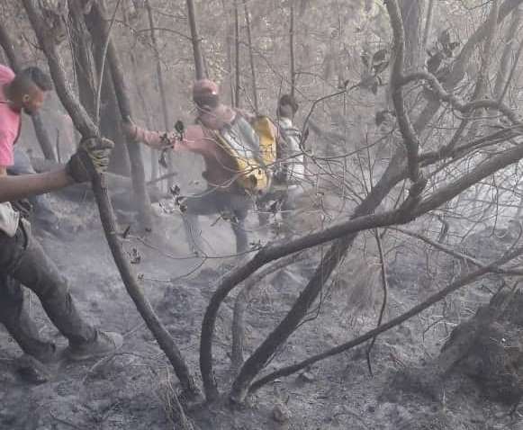Zitácuaro, Mich.- Derivado de un reporte vía telefónica, a las 6:00 de la tarde del día de ayer, el Cuerpo de Bomberos y Protección Civil, brigadistas, vecinos de la comunidad y ciudadanía, iniciaron el operativo de búsqueda de seis adultos atrapados en los peñascos del Cerro Cacique, quienes subieron a sumar labores para combatir el fuego.