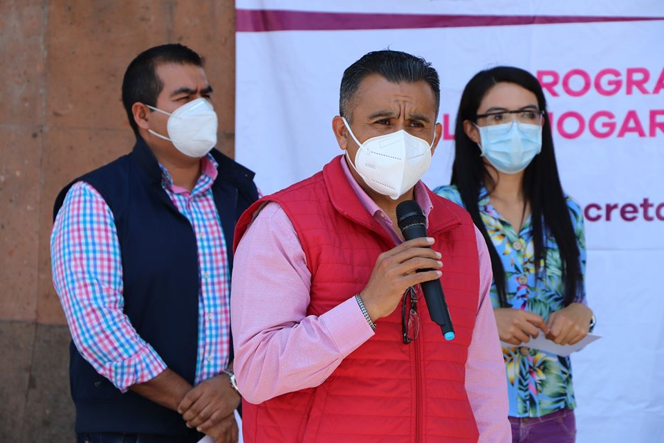 Zitácuaro, Mich.- El Gobierno de Zitácuaro encabezado por el presidente municipal Hugo Alberto Hernández Suárez, en las inmediaciones del centro de convenciones Suprema Junta Nacional Americana, llevó a cabo la tercera entrega del programa Apoyos a los Hogares y, por primera ocasión, el de Fortalecimiento al Campo, a través de la Secretaría de la Mujer, los cuales hasta ahora han beneficiado a más de 160 familias zitacuarenses con material a bajo costo.