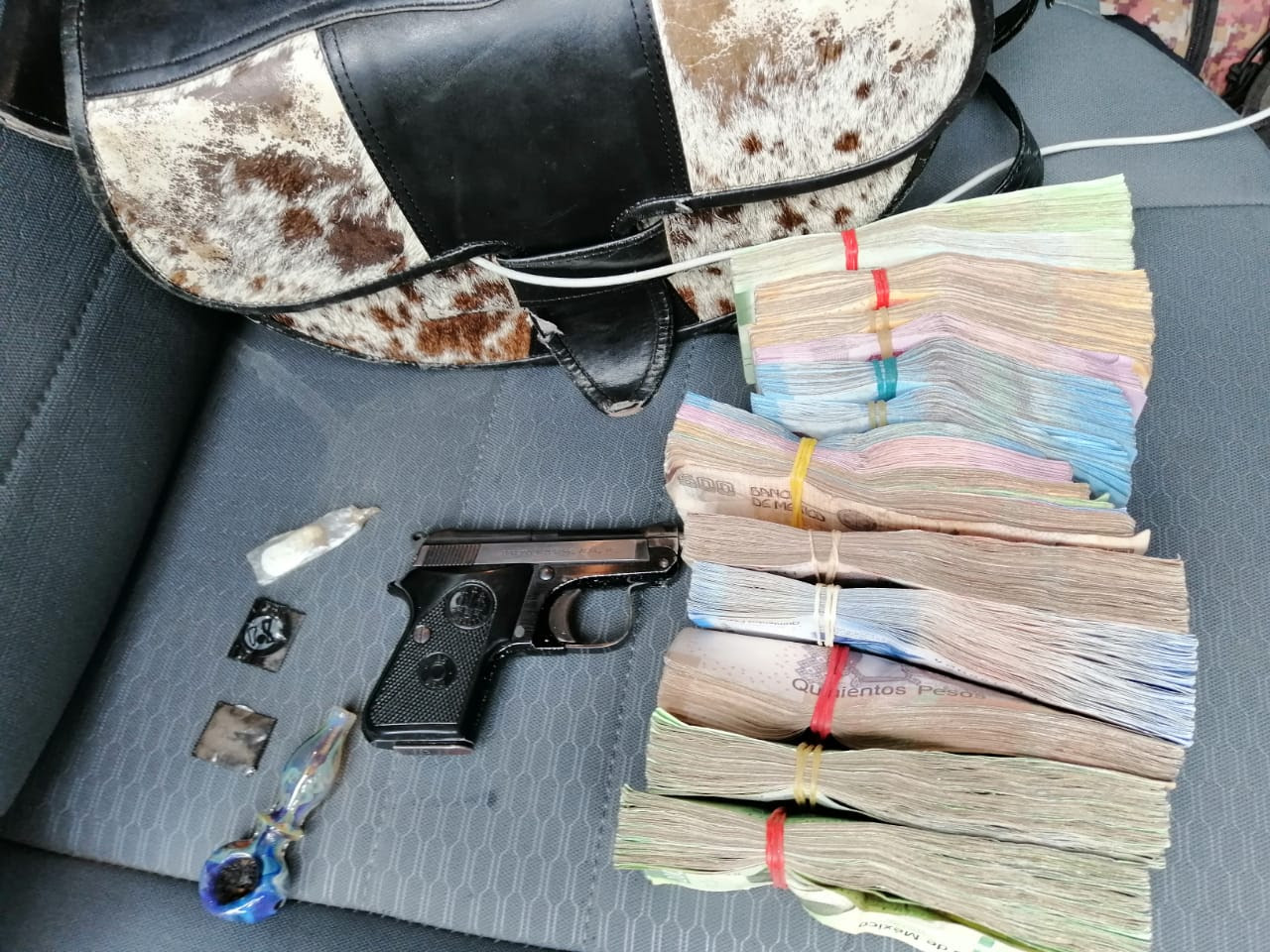 Tras efectuar una revisión a Jorge V., le fue localizada una pistola y la mencionada droga; además, al interior del automotor se localizaron 235 mil pesos, de los cuales se justificó el origen.