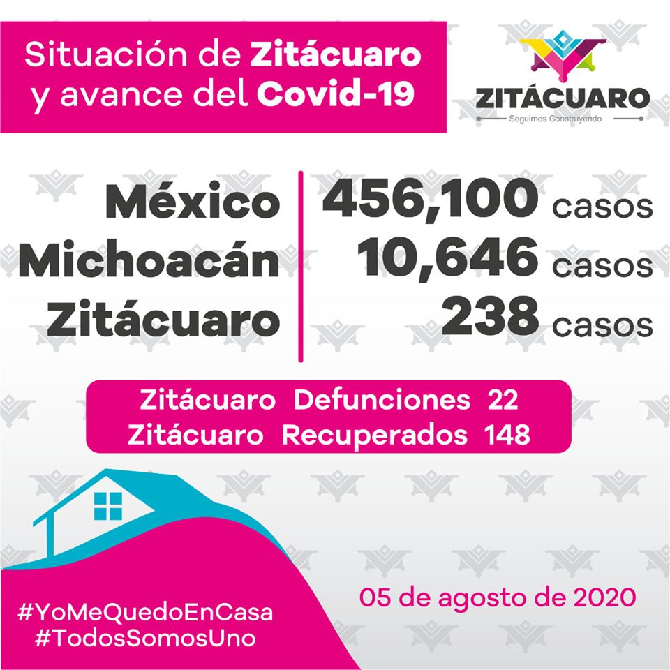 Zitácuaro, Mich.- El gobierno municipal de Zitácuaro que encabeza el alcalde Hugo Alberto Hernández Suárez informa la situación de covid-19 en Zitácuaro, de acuerdo al reporte diario emitido por el Comité Estatal de Seguridad en Salud y a la información pública, que se encuentra disponible en https://michoacancoronavirus.com/nuevaconvivencia/ con corte al 5 de agosto de 2020: