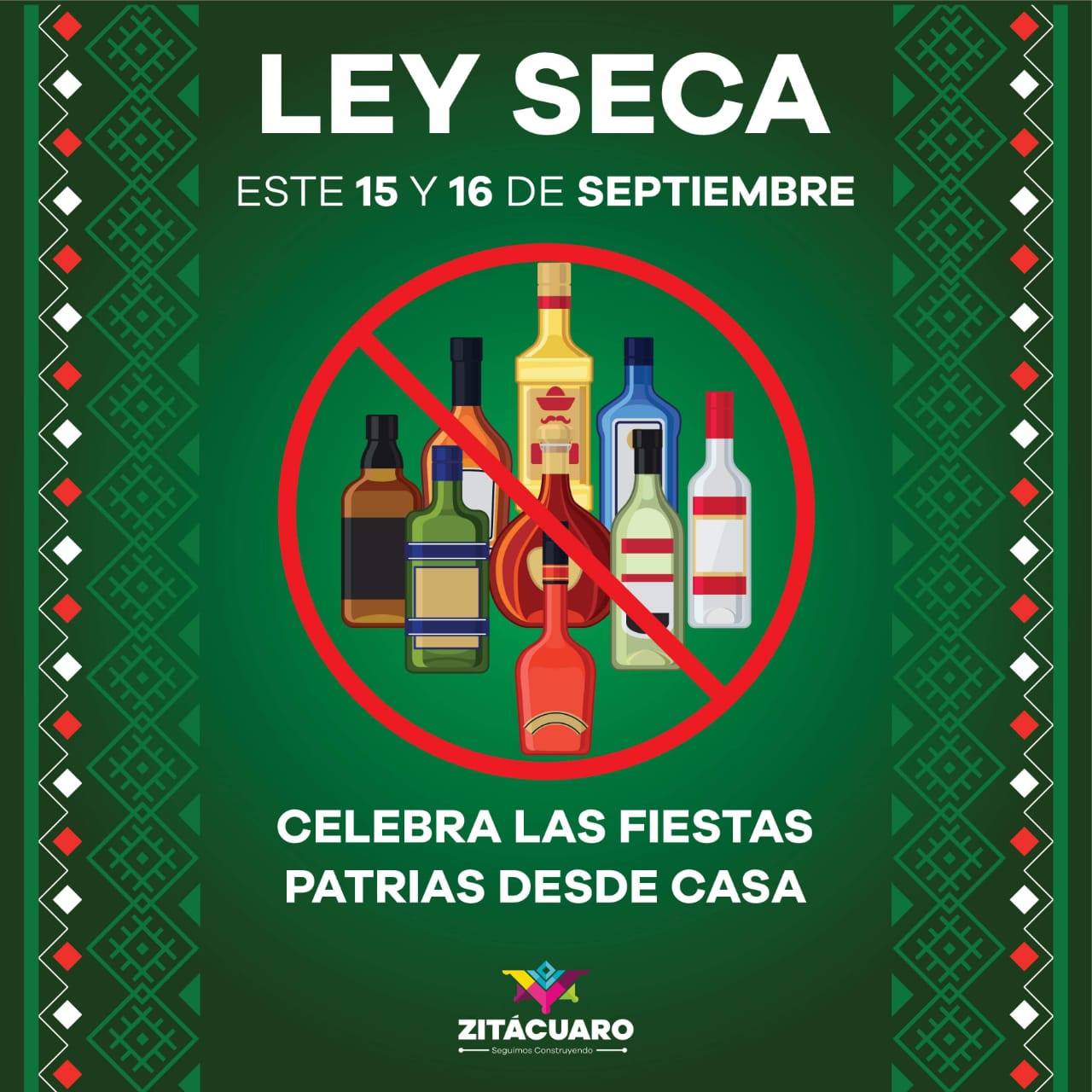 Zitácuaro, Mich., 14 de septiembre del 2020.- El Gobierno municipal, a través de la Dirección de Ingresos Públicos municipales, informó que, el 15 y 16 de septiembre, aplicará ley seca en todo el municipio, por lo que queda estrictamente prohibida la venta de cualquier tipo de bebidas alcohólicas, a fin de continuar evitando reuniones, actividades masivas y la concentración de personas, ante el riesgo que sigue vigente ante la pandemia por COVID-19.