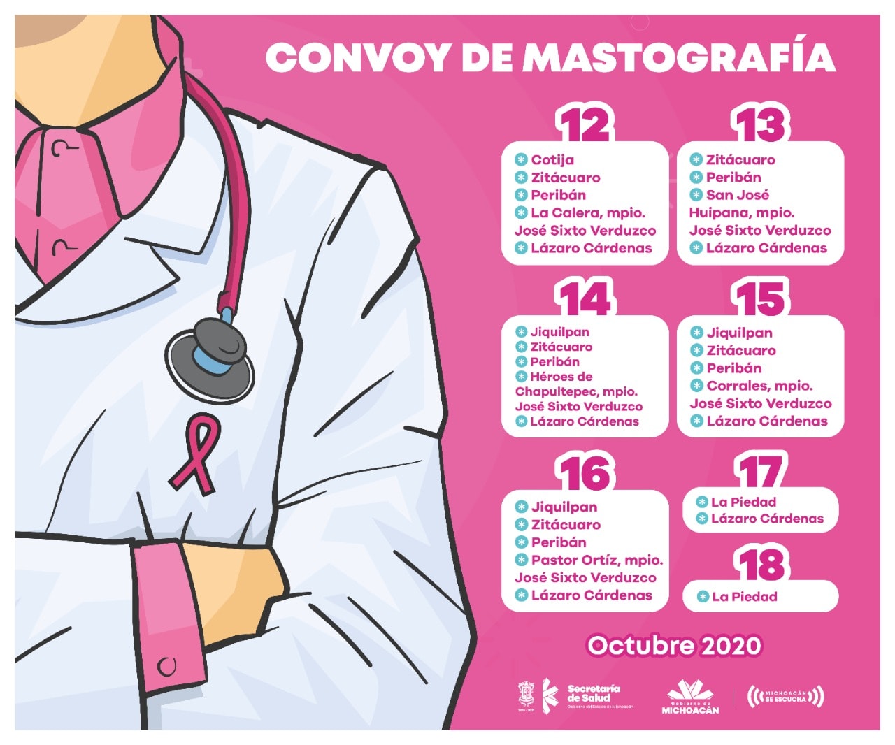 Zitácuaro, Mich.- La Secretaría de Salud de Michoacán (SSM), en conjunto con el Gobierno municipal que preside el alcalde Hugo Alberto Hernández Suárez, desplegarán del 12 al 18 de octubre, unidades móviles de mastografía en beneficio de las mujeres de comunidades indígenas o de difícil acceso.