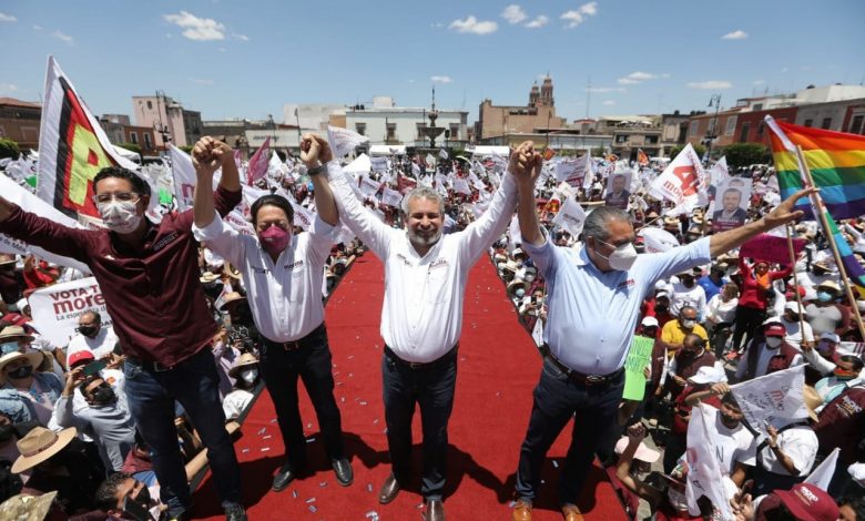Los canallas, los sinvergüenzas, esos que usan el poder para sus propios negocios, intentaron frenarnos, pero aquí estamos de pie, dijo Ramírez Bedolla después de un mes de que Morena no pudiera iniciar campaña electoral por la gubernatura