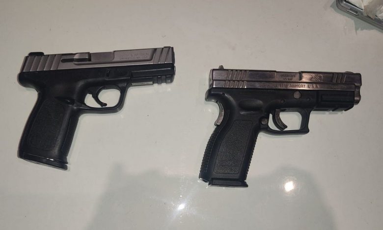 Por lo anterior, se inició una persecución, dándole alcance a los ahora detenidos mismos que, al realizarles una inspección, les fueron localizadas entre sus pertenencias dos armas de fuego calibres .45 mm., y .9 mm., respectivamente, 10 cartuchos útiles y dosis de la citada droga.