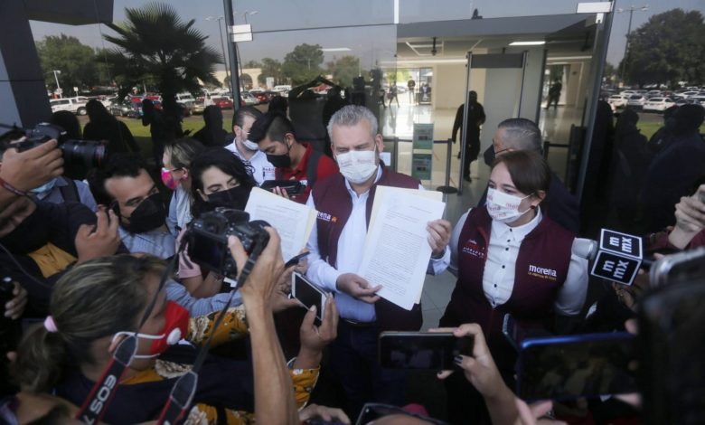 Los morenistas presentaron la denuncia ante la Fiscalía Especializada en Delitos Electorales, e hicieron un llamado al gobernador Silvano Aureoles a sacar las manos del proceso electoral.