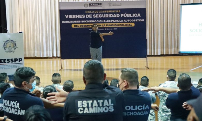 Morelia, Michoacán a 21 de Mayo del 2021.- Dando continuidad al ciclo de conferencias “Viernes de Seguridad Pública”, el Instituto Estatal de Estudios Superiores en Seguridad y Profesionalización Policial del Estado de Michoacán (IEESSPP), ofreció la conferencia “Habilidades Socioemocionales para la Autogestión del Desempeño en la Función Policial”.