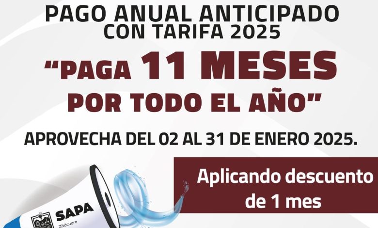 H. Zitácuaro Mich 2 enero del 2025.-¡Aprovecha el Descuento por Pago Anticipado del Agua durante enero que te ofrece el SAPA Zitácuaro!