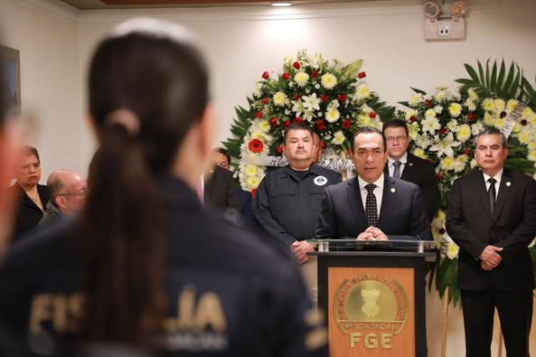 Morelia, Michoacán, a 8 de febrero de 2025.- En el marco del homenaje póstumo al comandante de la Policía de Investigación, Víctor Fernando Ponce Cruz, quien falleció ayer víctima de una agresión perpetrada por cobardes criminales, el Fiscal General del Estado de Michoacán, Adrián López Solís, hizo un llamado a las y los servidores públicos de la Institución para actuar en el camino de la rectitud, honestidad, legalidad, determinación, firmeza y valor.
