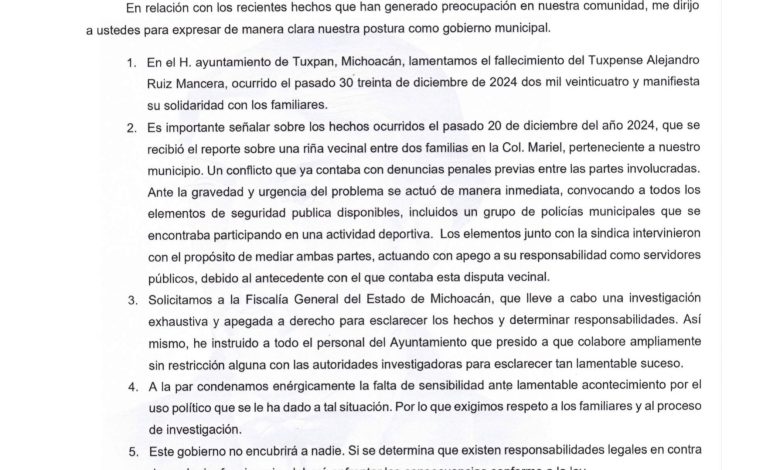 Tuxpan, Mich., 2 de enero de 2025.- a través de un comunicado oficial, el gobierno de Tuxpan precisa su postura ante los hechos suscitados en este municipio, donde perdiera la vida el señor Alejadro Ruiz Mancera .