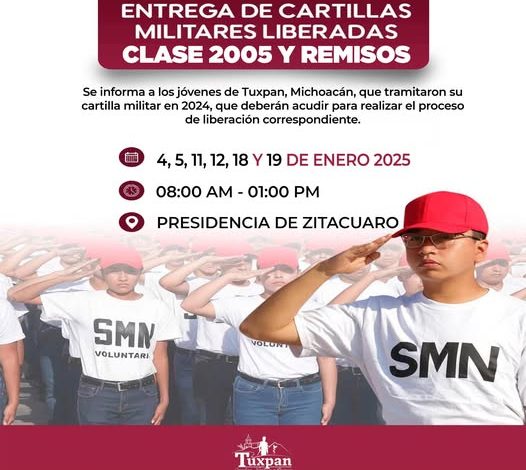 Tuxpan, Mich., 6 de enero de – El Gobierno de Tuxpan, invita a los jóvenes que deseen liberar su cartilla militar a que acudan a la ciudad de Zitácuaro, en las fechas señaladas para realizar el trámite correspondiente