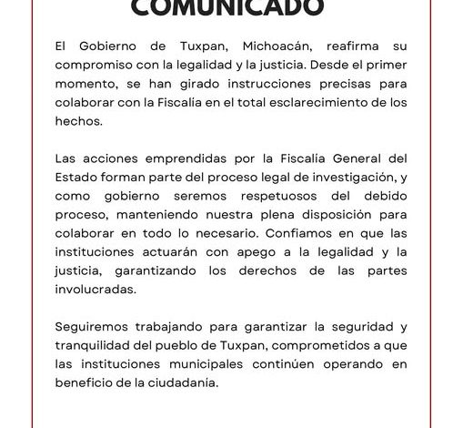 Tuxpan, Mich., 29 de enero de 2025.- El Gobierno de Tuxpan emitió un comunicado oficial donde reafirma su compromiso con la legalidad y la justicia.