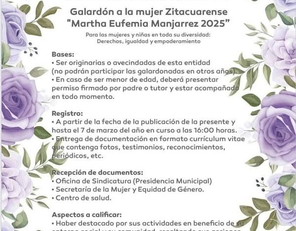 Zitácuaro, Mich., 3 de marzo de 2025.- El Ayuntamiento de #Zitácuaro y el DIF Municipal convocan al Galardón a la Mujer Zitacuarense “Martha Eufemia Manjarrez 2025”.