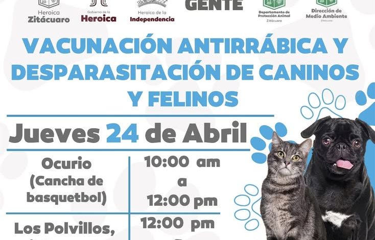 Este jueves 24 de abril se llevará a cabo, en Ocurio y Los Polvillos, en la Tenencia de Ziráhuato, una jornada de salud animal dirigida a caninos y felinos. La actividad es organizada por el Departamento de Protección Animal del Municipio.