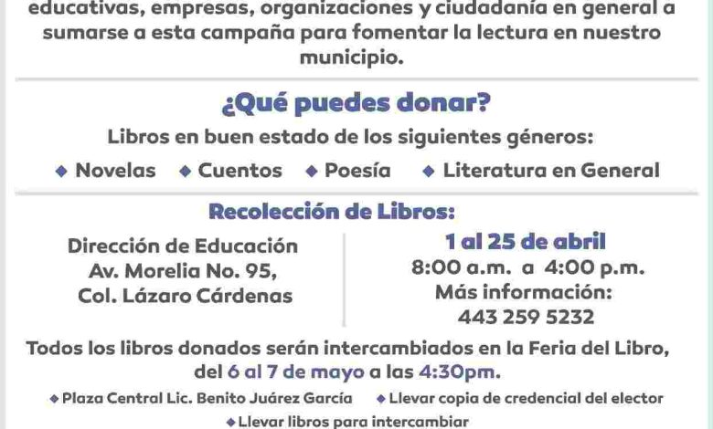 Estarán recibiendo los ejemplares en buen estado hasta mañana, 25 de abril, en la Dirección de Educación (Av. Morelia No. 95, Col. Lázaro Cárdenas), en un horario de 8:00 a.m. a 4:00 p.m.