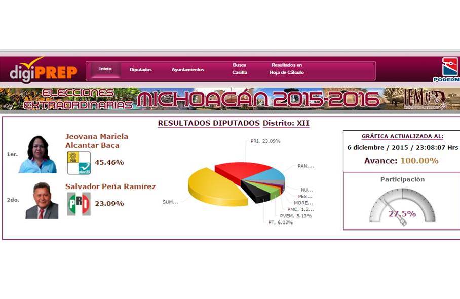 Ciudad Hidalgo, Michoacán. 06 de diciembre del 2015.- El Programa de Resultados Preliminares (PREP) y encuestas de salida del Partido de la Revolución Democrática (PRD) posicionan a Jeovana Alcántar Baca como la virtual ganadora en el Distrito de Hidalgo.